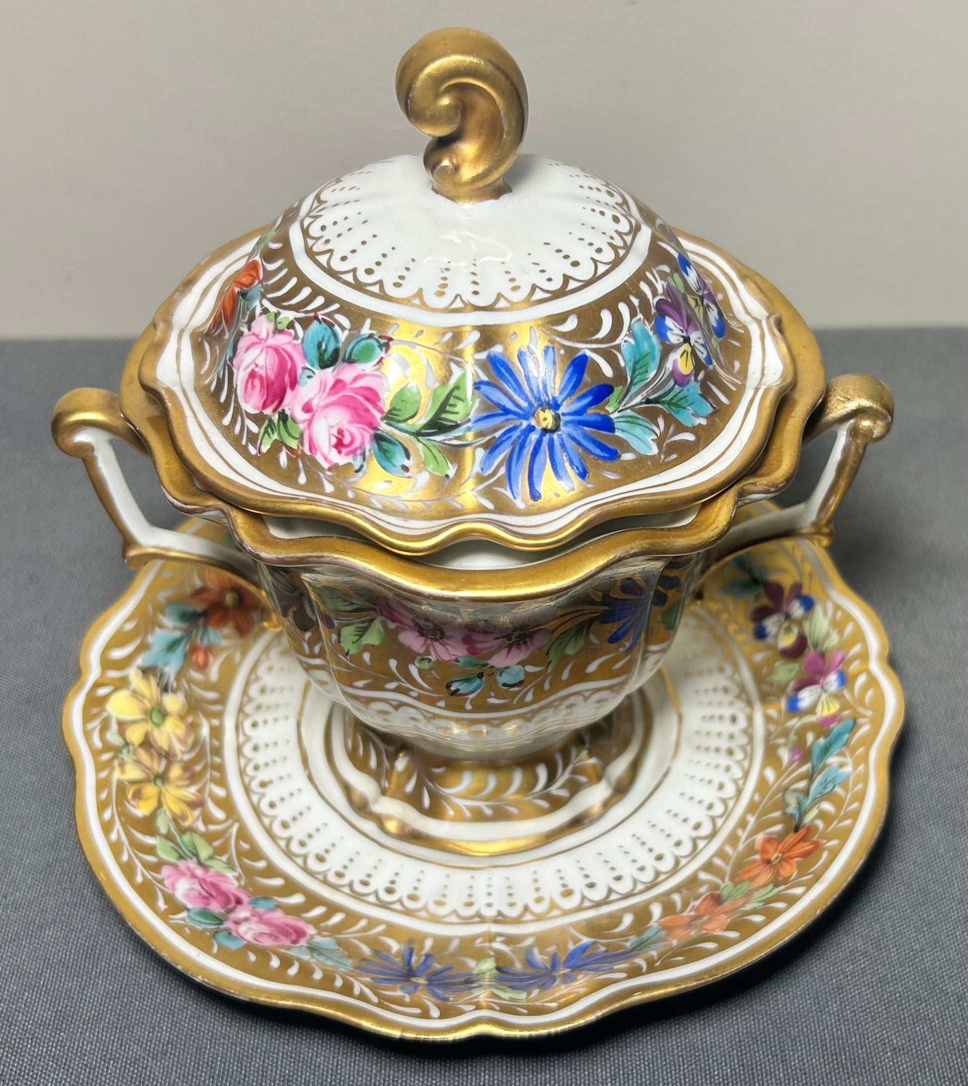 1930’s French Halga Limoges Napoleon III Style Porcelain Hand-Painted Gilded Floral Motifs Footed Chocolate Pot with Underplate