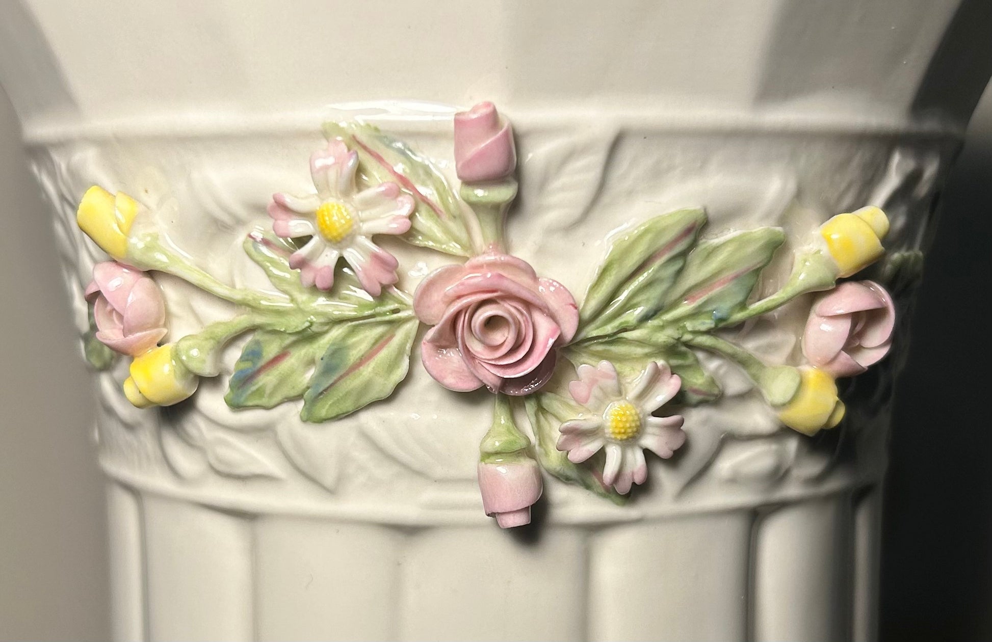 Experience the stunning craftsmanship of this 2001 Irish Belleek Porcelain Annual Piece Tree of Life Limited Edition Vase. This charming European-crafted vase features a ribbed body, applied flowers, and a molded band with floral motifs. Adorned with intricate details, it is a true work of art that will make a statement in any home.