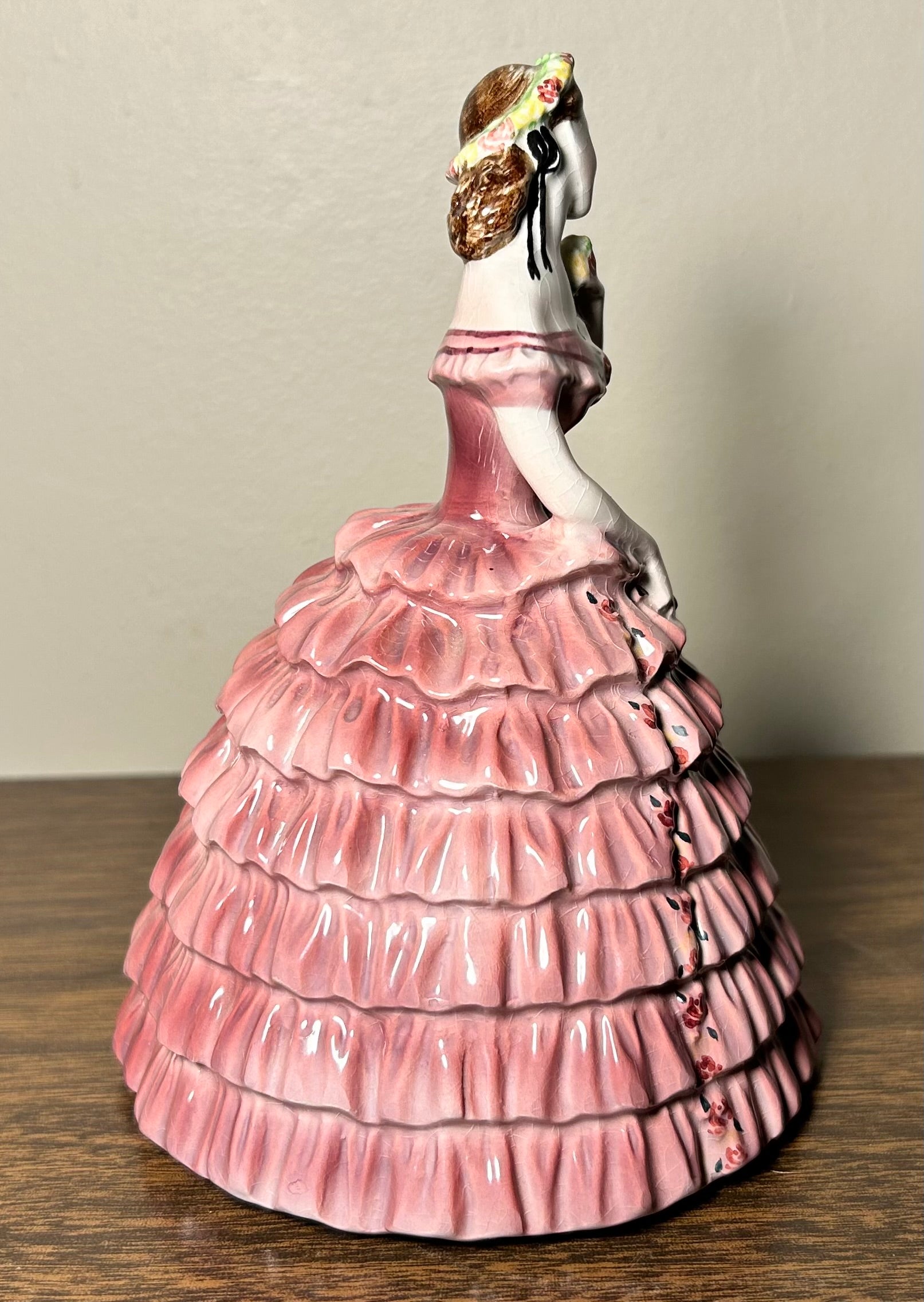 Step back in time with this stunning Circa 1948 American Goldscheider Everlast Corp. Ceramic Quadrille Woman Figurine by P. Porcher. This lovely antique piece depicts a woman wearing a vibrant pink dress adorned with beautiful roses, perfectly capturing the historic quadrille dance.