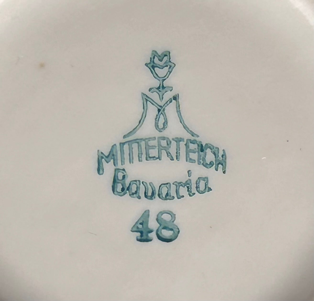 This exquisite pair of 1940’s German Mitterteich Bavaria porcelain personal ashtrays features elegant gilding and violet flower motifs. Ideal for collectors of fine porcelain or smoking accessories, these decorative pieces add a lovely touch of antique European charm to any space.