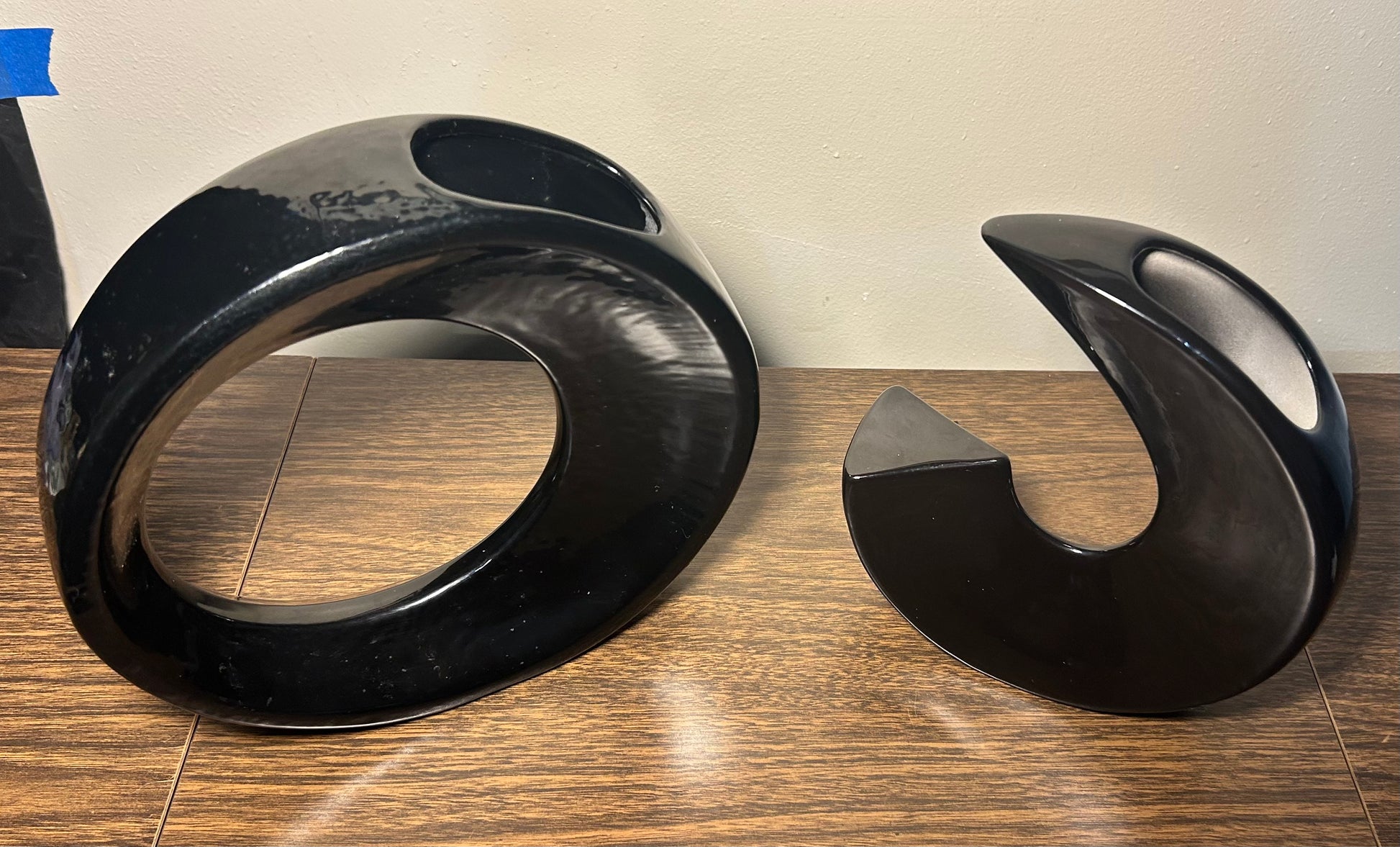 Up for sale is a Set of 2 Vintage 1970’s Japanese Postmodern Pottery Black Ceramic Ikebana Vases! The ring vase measures 9 3/8” tall. The crescent vase measures 8 1/4” tall. The set is in excellent overall condition with minor sign of wear consistent with their age and use. Please message us if you have any questions. Thanks!