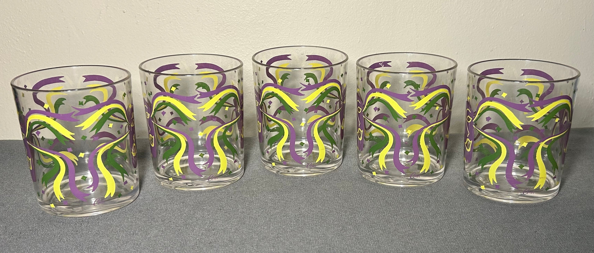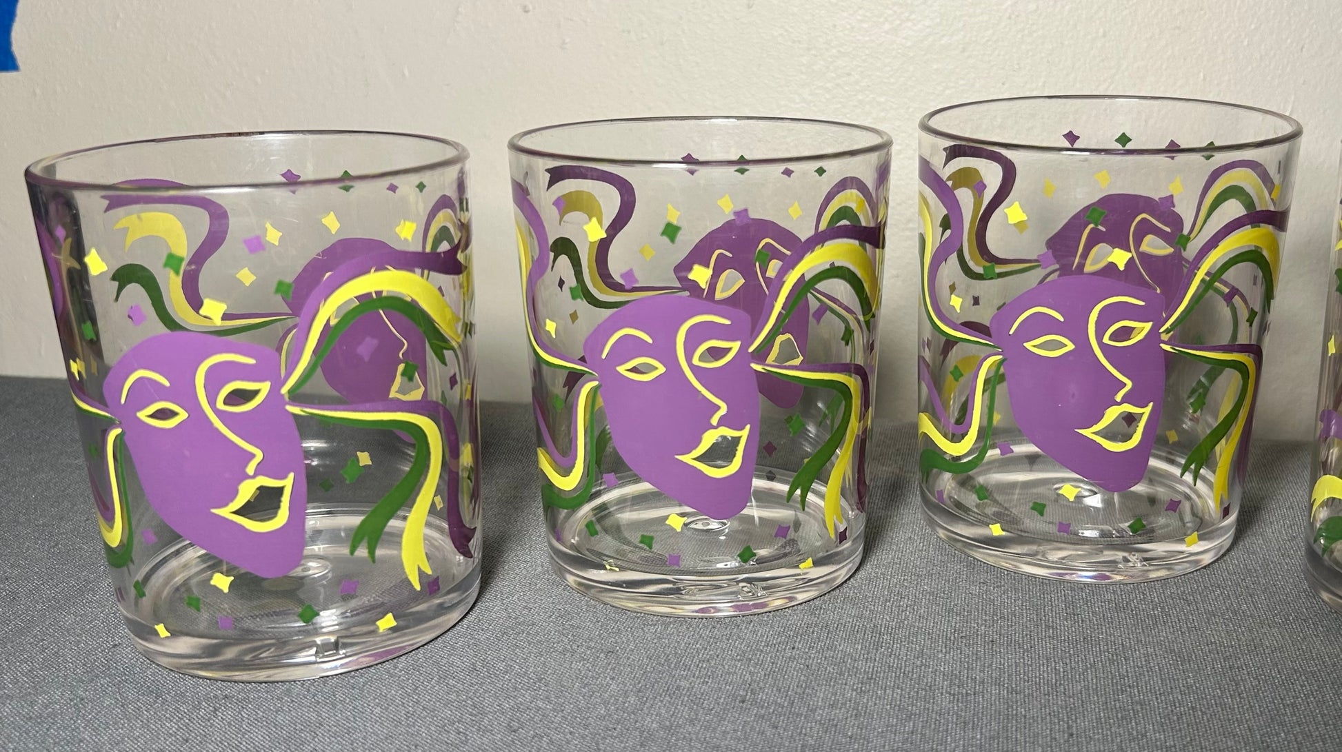 Add some classic Mardi Gras style to your bar with this set of 5 Vintage 1960’s American Cera Mid Century Modern Mardi Gras Mask Motif Plastic Lowball Glasses. With a touch of New Orleans influenced charm, these glasses are perfect for serving up your favorite drinks. Elevate your bar decor with this unique drinkware set.