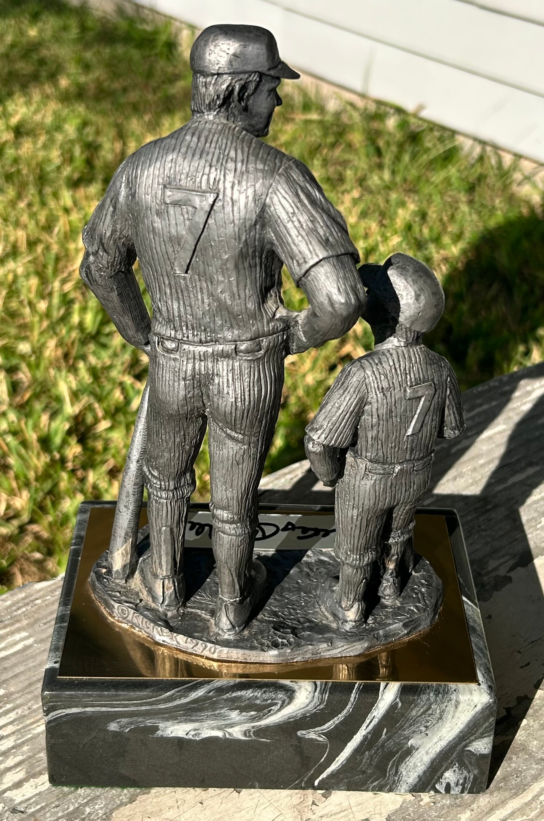 This vintage Michael Ricker sculpture, "The Legend Lives", showcases the iconic New York Yankees baseball legend, Mickey Mantle, standing next to a bat boy. Crafted by the renowned artist Michael Ricker in New Orleans and signed in marker by Mickey Mantle, this pewter limited edition sculpture (#465/500) is displayed on an elegant black and white marble base, making it a must-have for any sports memorabilia fan or Louisiana artist collector.