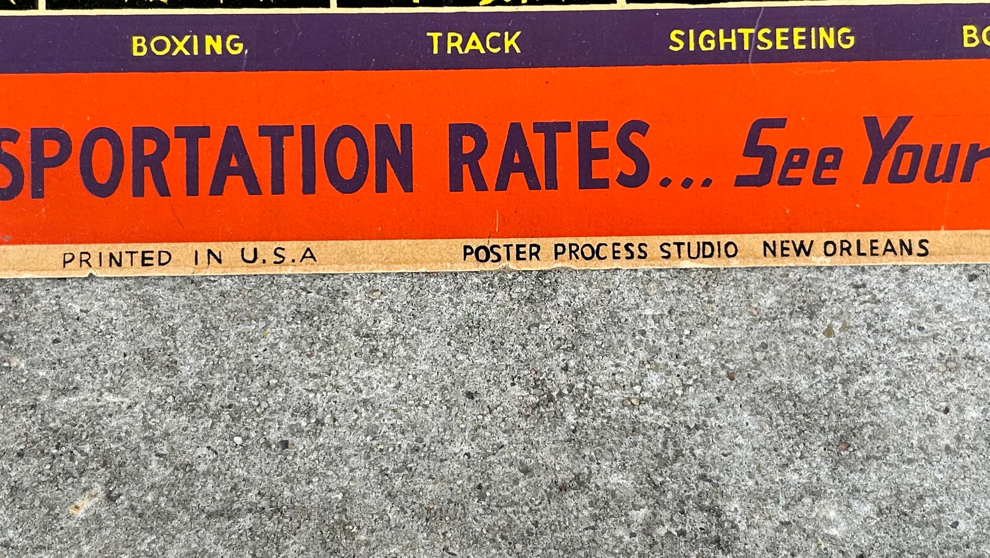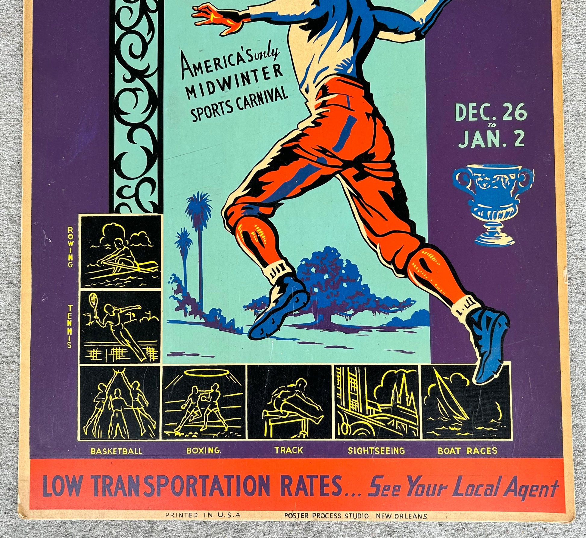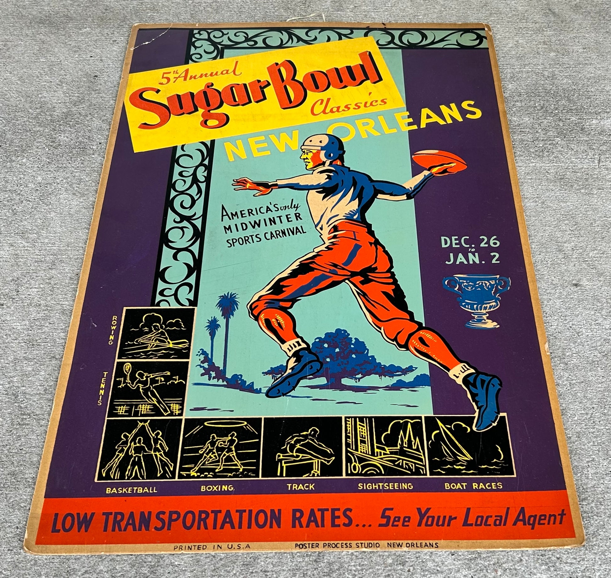 This rare antique cardboard advertising sign from the 1939 5th Annual Sugar Bowl Classics in New Orleans showcases a quarterback throwing a football and promotes the various athletic events and low transportation rates available during "America's Only Midwinter Sports Carnival." The game itself saw the consensus national champion Texas Christian University Horned Frogs defeat the Carnegie Tech Tartans. A perfect addition for any Louisiana sports memorabilia collection.