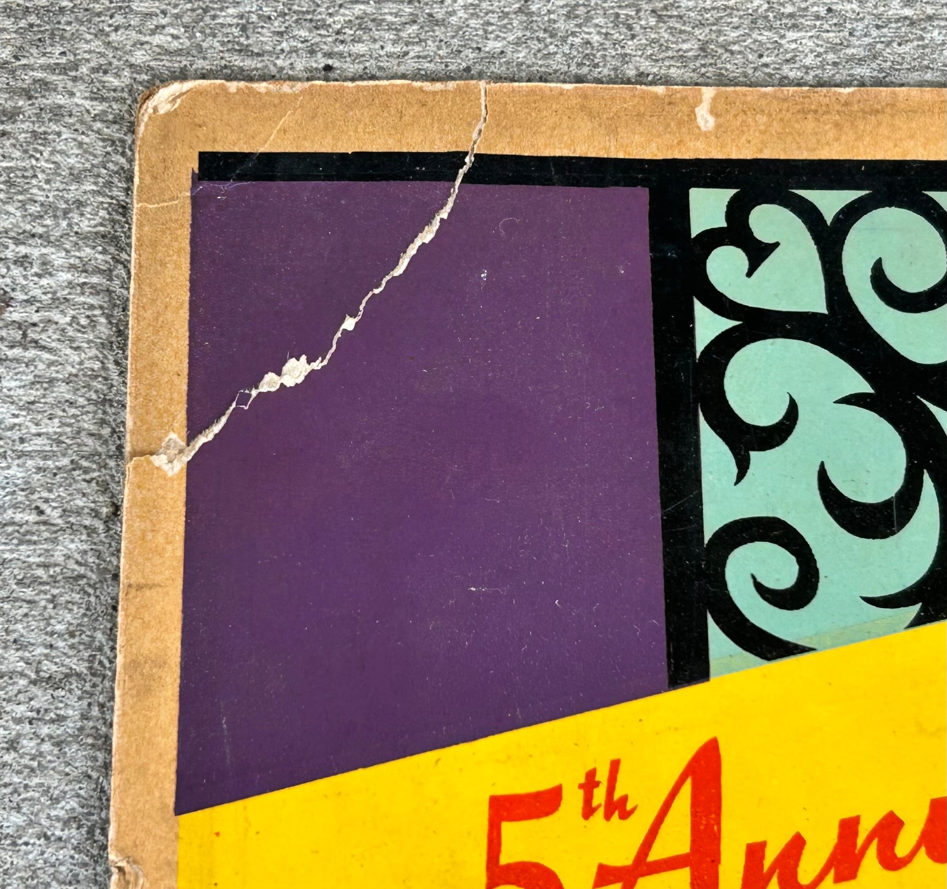 Up for sale is a 1939 5th Annual Sugar Bowl Classics New Orleans Football Cardboard Advertising Sign! It measures 22 1/8” by 14”. The piece is in very good condition overall condition with signs of wear consistent with its age and use (taped repairs to upper left corner and small tip of upper right corner; some scattered light surface wear (see pics)). Please message us if you have any questions. Thanks!