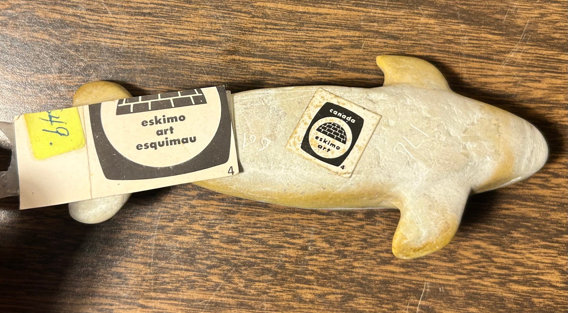 Add a unique piece of Inuit art to your collection with this vintage Canadian Inuit Argillite Whale Carving by Simeonie Kavik. Crafted in the 20th century, this exquisite piece showcases beautiful hues of white and light brown, making it a fantastic and eye-catching addition to any display. A must-have for art enthusiasts and collectors alike.