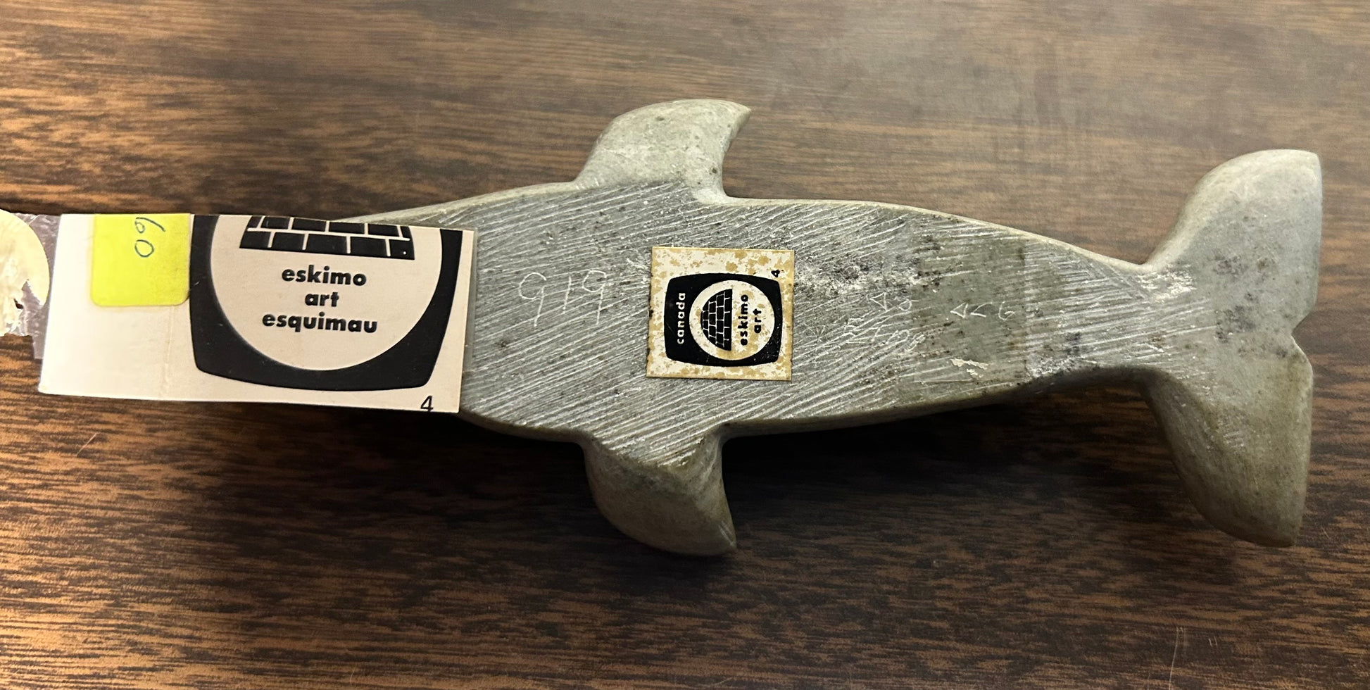 Up for sale is a Vintage Canadian Inuit Soapstone Whale Carving by Annie Appaqaq (20th Century)! It is signed with the disc number E9-108. It measures 5 3/4” long. The piece is in excellent overall condition with minor signs of wear consistent with its age and use. Please message us if you have any questions. Thanks!