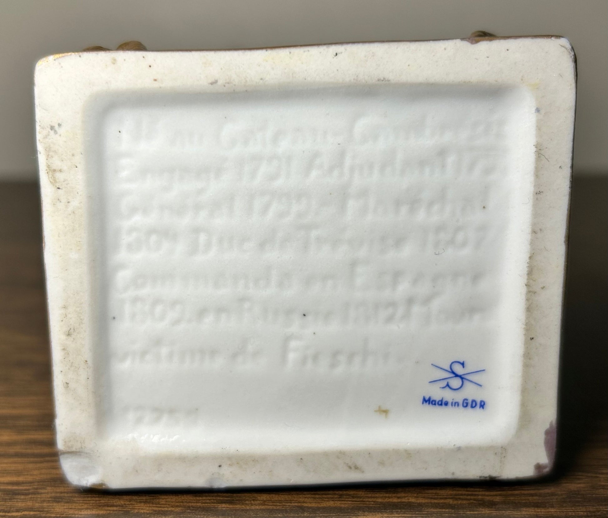 This Vintage Circa 1950 German Scheibe-Alsbach Kister Porcelain Mortier French Soldier Figurine is a fantastic find for antique porcelain or military history enthusiasts. Expertly crafted in Europe, this piece depicts a Napoleonic era military figure, adding a historical and cultural touch to your home decor or militaria collection.