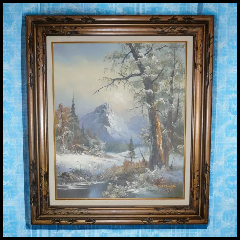 Transport yourself to a serene winter wonderland with this vintage landscape painting by L. Harding. The snow-covered mountains and forest come to life in vivid oil colors, framed in a stunning carved wooden frame. Expertly executed, this piece will add a touch of beauty and nostalgia to any room.
