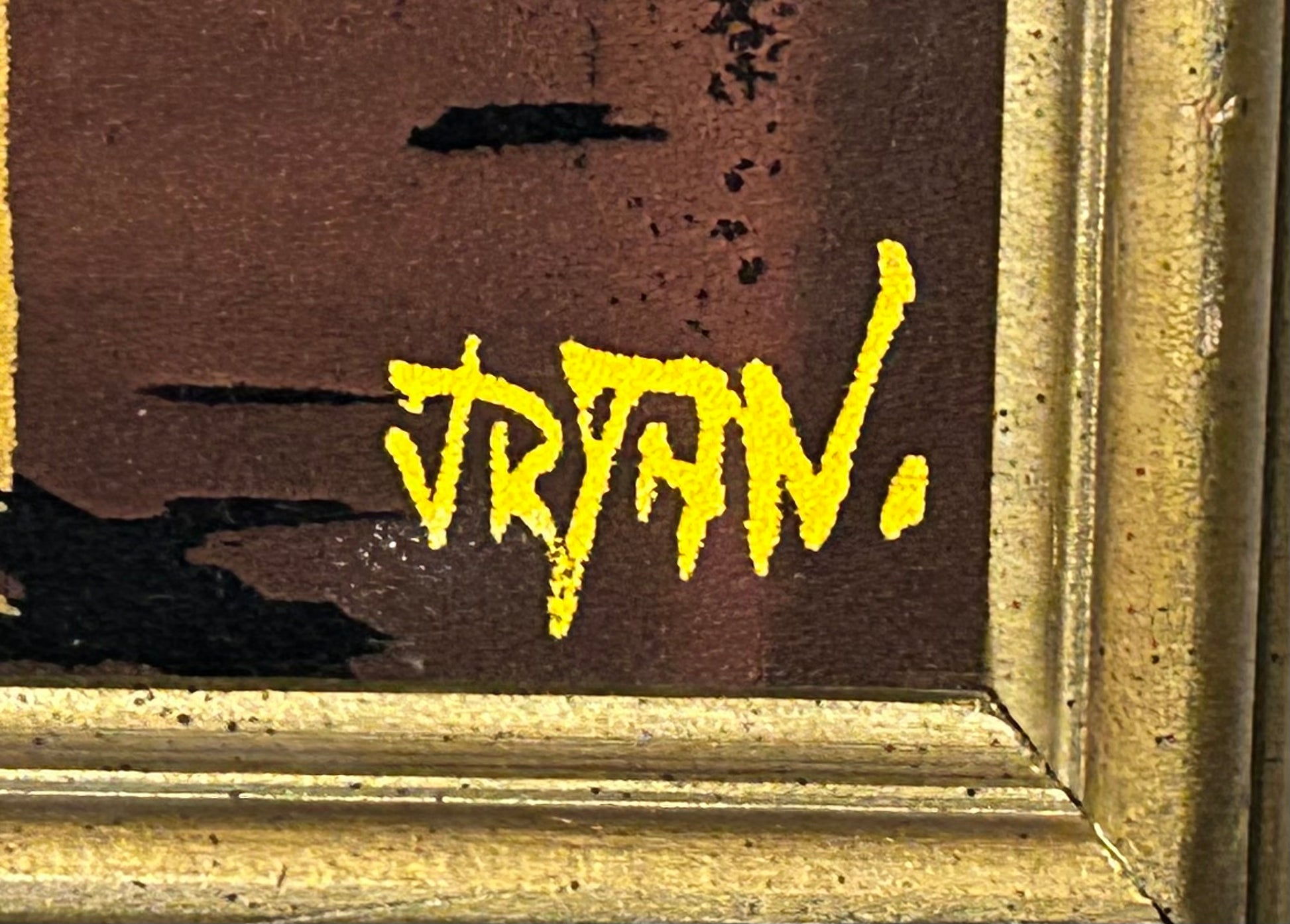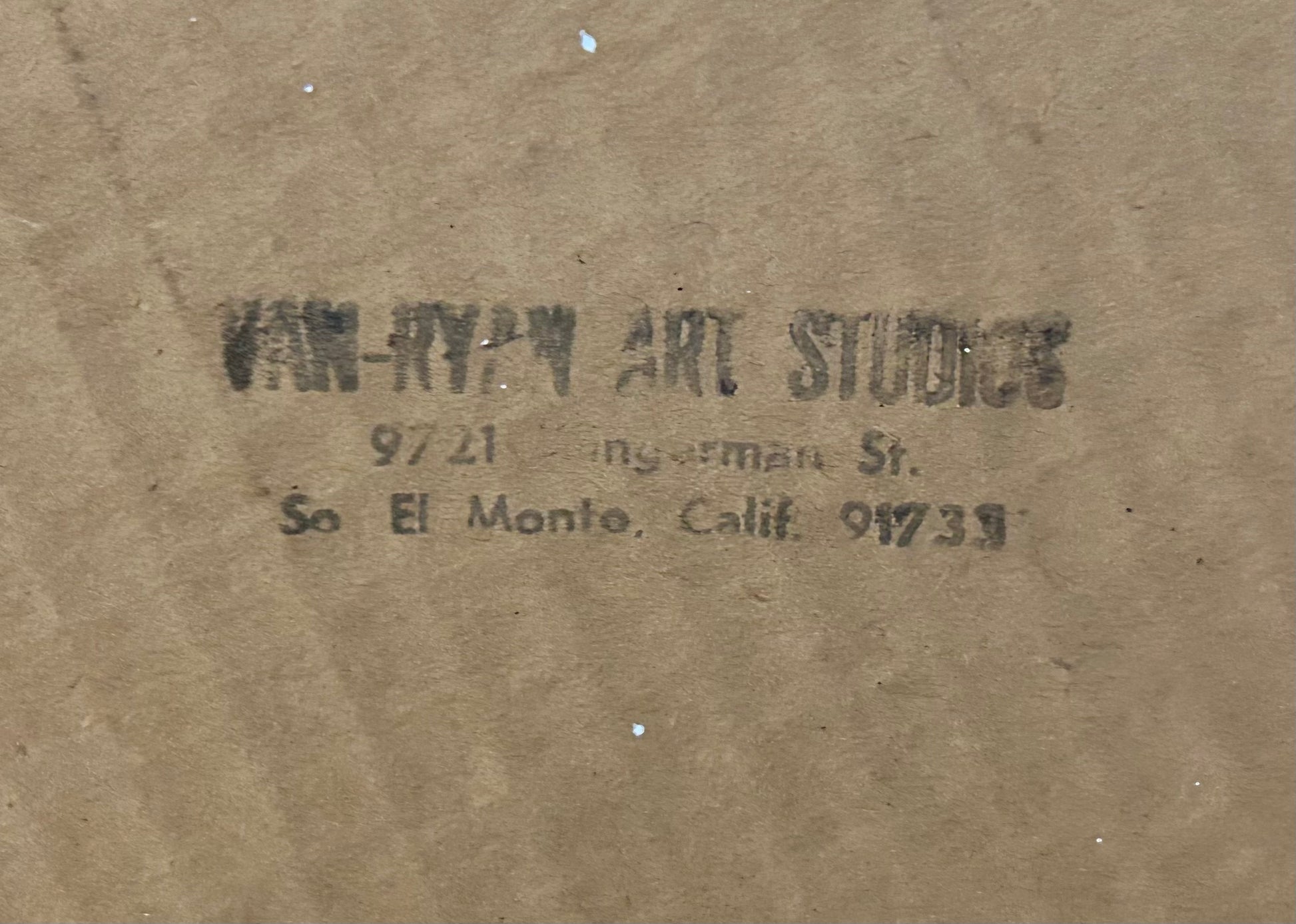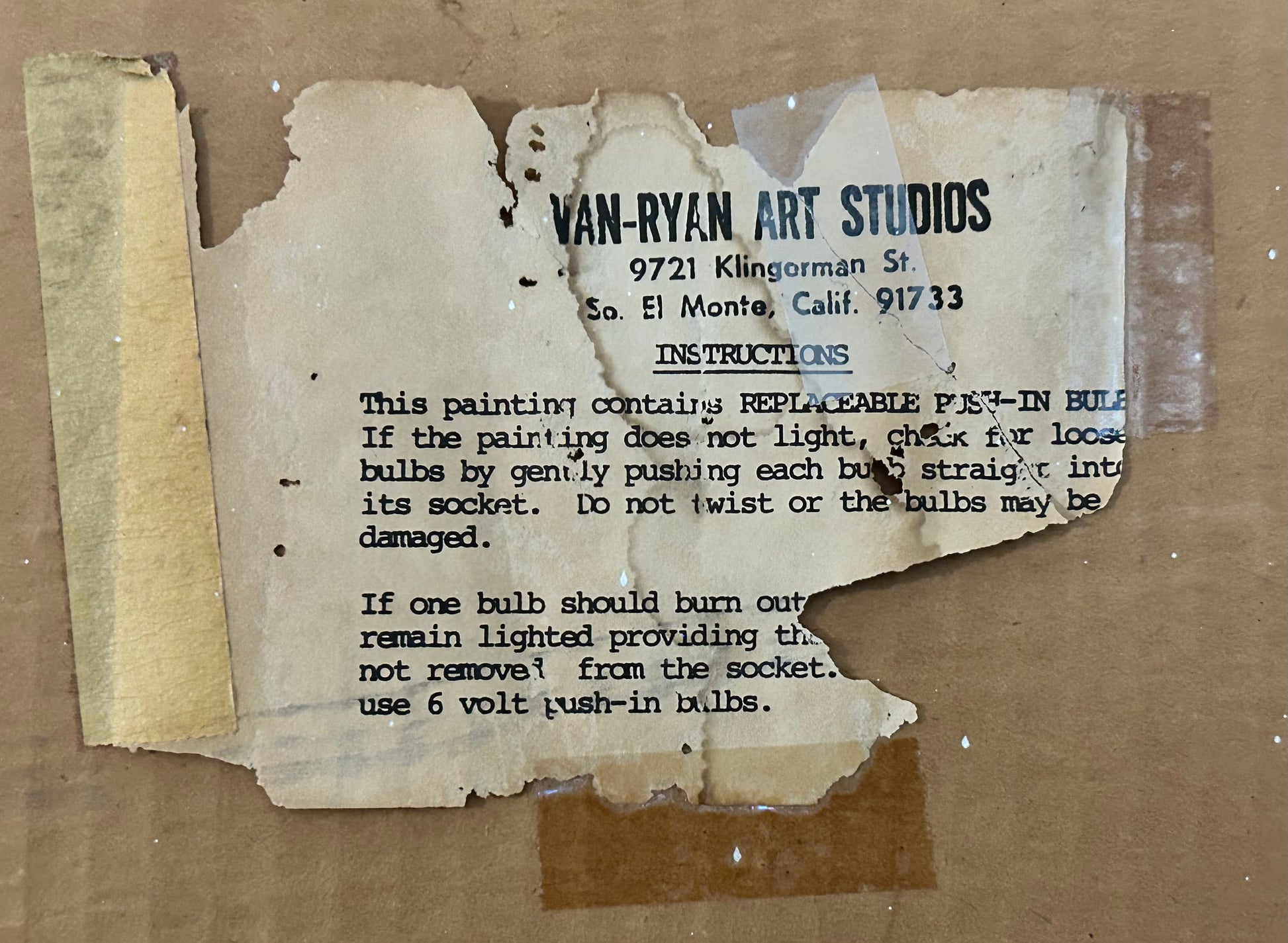 Up for sale is a Vintage Mid 20th Century American Mid Century Modern Van-Ryan Art Studios Spanish Style Courtyard Framed Light Up Black Velvet Painting (California)! It measures 50 1/8” wide, 27” tall, and 1 3/4 deep. The piece is in great overall condition with minor signs of wear consistent with its age and use (some scattered light surface wear to wood frame and velvet; a few lights burnt out). Please message us if you have any questions. Thanks!