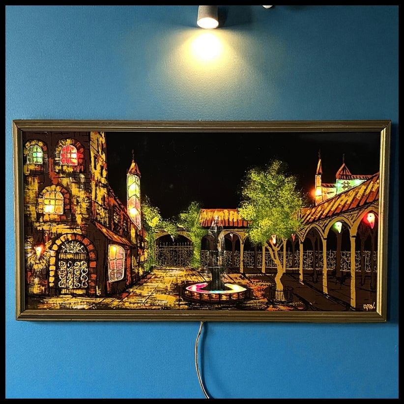 This Vintage Mid 20th Century American Mid Century Modern Van-Ryan Art Studios Spanish Style Courtyard Framed Light Up Black Velvet Painting adds a touch of vibrant, unique art to your home. With its colorful design and ability to illuminate when plugged in, this piece serves as an eye-catching addition to your wall. A must-have for any vintage art enthusiast.