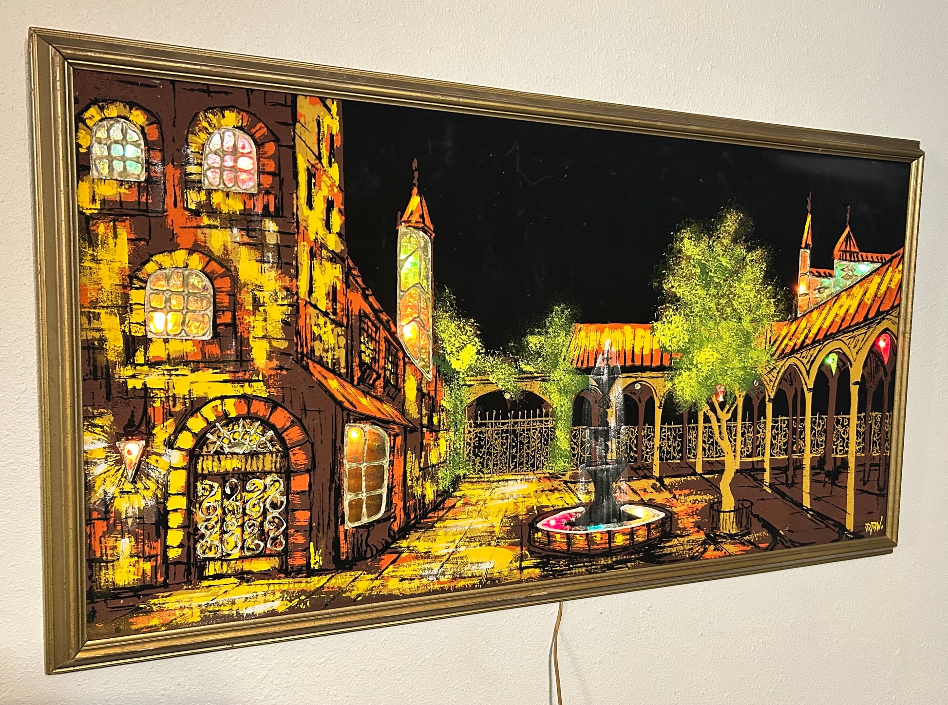Vintage Mid 20th Century American Mid Century Modern Van-Ryan Art Studios Spanish Style Courtyard Framed Light Up Black Velvet Painting (California)